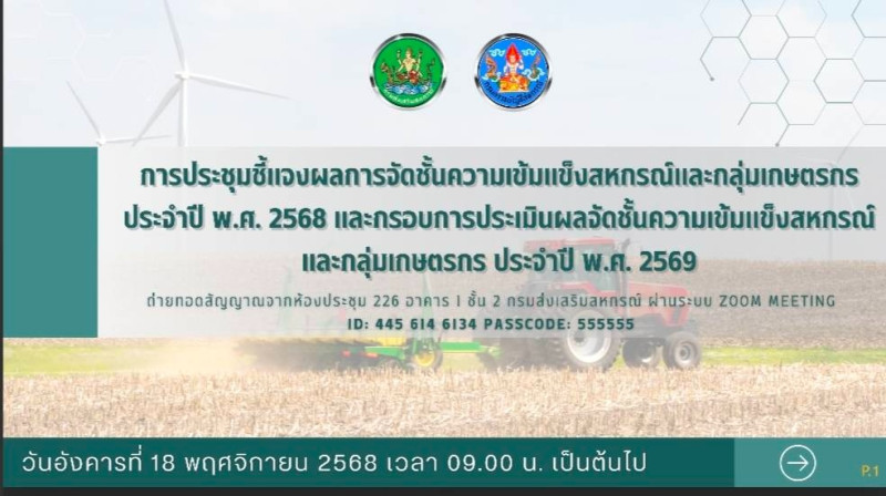 วันที่ 18 พฤศจิกายน 2568 เวลา 09.00 น. นายอภิรักษ์ พานนูน สหกรณ์จังหวัดนครพนม พร้อมด้วยบุคลากรกลุ่มงาน และกลุ่มส่งเสริมสหกรณ 1-5 เข้าร่วมประชุมชี้แจงผลการจัดชั้นความเข้มแข็งสหกรณ์และกลุ่มเกษตรกร ประจำปี พ.ศ. 2568 และกรอบการประเมินผลจัดชั้นความเข้มแข็งสหกรณ์และกลุ่มเกษตรกร ประจำปี พ.ศ.2569 ผ่านระบบ Zoom Meeting จากกรมส่งเสริมสหกรณ์ โดยมีนายมนัส เทพรักษ์ รองอธิบดีกรมส่งเสริมสหกรณ์ เป็นประธานในพิธีเปิดการประชุม ณ ห้องประชุมราชพฤกษ์ ชั้น 3 สำนักงานสหกรณ์จังหวัดนครพนม และ ณ ที่ทำการกลุ่มส่งเสริมสหกรณ์